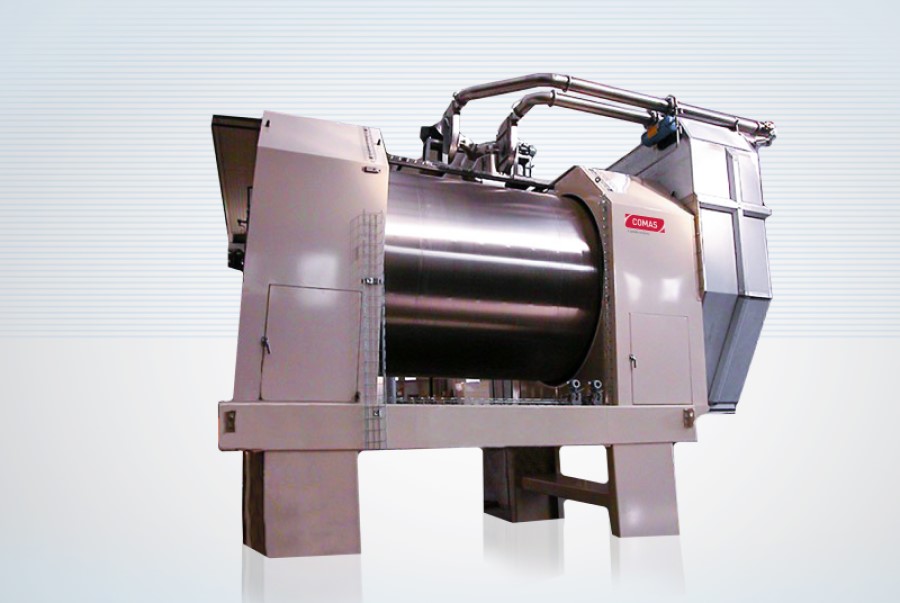 The COMAS Flavour cylinder combines the process of final flavour application with mixing of the cut tobacco blend, prior to going to the bin/case filling station, silos or cigarette makers. The flavour is applied by using special air atomised sprays, to apply a pre-set application rate, with the flavour contacting the tobacco as it cascades in even free fall in the cylinder, after being rotationally lifted and released. This combined with the continuous mass flow prior to the flavour cylinder and by lightly volumetric loading of the cylinder, allows 100% product contact with the flavour process.